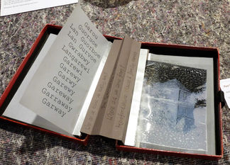 The instruction - and challenge - from the Herefordshire Archive and Record Centre (HARC) was to celebrate 60 years of archive keeping in Herefordshire by creating a work of art in one of their red boxes that used to store glass plate negatives. The call was not specifically for artist's books, but ten artists from Marches Book Arts Group accepted the challenge and created the unique mixed media artwork seen here (although we didn't create the beautiful cake with roses) with the display running from mid-July to 26 October 2018.